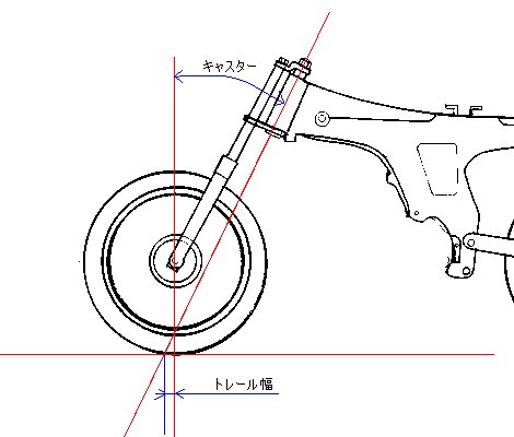 トレール幅はフロントタイヤの方向付けの役割に関係している。単純に考えるとトレール幅が長い方が直進安定性が高い。逆にトレール幅が短いと操縦性が軽快になります。トレール幅はキャスター角によって左右されますが、フロントフォークとステアリング軸のオフセット量によっても変化します。