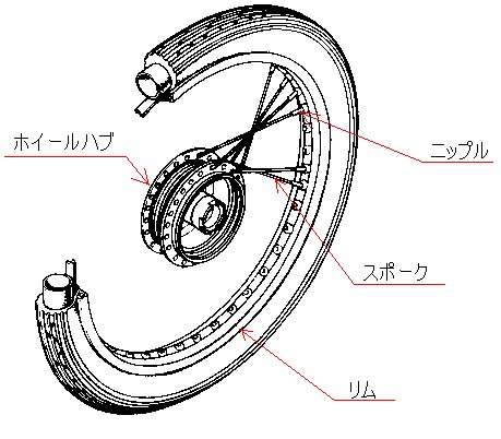 アクスルシャフトが通るホイールハブ(※)とタイヤがはめ込まれるリム、それらを繋げるスポークとスポークを固定するニップルで構成されています。ハブ、リム、スポークの組み合わせによりいろんなスタイルにする事が出来ます。キャストホイールに比べると、軽く路面とのショックを吸収し、柔らかい走りをしますがその柔らかさが逆に、高速走行時に若干の「横ブレ」が発生するという弱点があります。ホンダ横型エンジンの最高速はたかが知れているで、それほど神経質になる必要はないと思いますが、芯のずれているホイールは厳禁です。