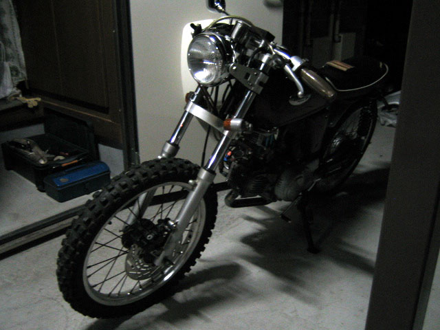 限りなく理想なカタチ | そんなこんなで、とりあえずブレーキとして機能するようになったので、ブロックタイヤのままだったが試走してみた。レバーを握るとカツカツと鳴る音がやる気にさせる。気になるブレーキの効き具合だが、ブロックタイヤの予想外な挙動に戸惑い、それどころではなかった。(汗) ブロックタイヤって乗りにくいね!! まぁセパハンにこんなタイヤ付けてるほうが悪いって話だろうケド。で、第一印象としては、ドラムよりはマシかなぁ程度。まだ当たりも出てないし、最初としてはこんなもんかな?ロックするのをビビってあんまり強く握らなかったのもあると思われる。普通のタイヤに履き替えてから、比較してみることにしよう。それより気になったのは、スピードメーターがやたらハッピーな数字を叩き出していたこと。2速で80km/h近くでるってどゆこと?(汗) 考えてみると、今まではベンリィのメーターギアを使っていたわけだが、タイヤサイズは2.25→2.75にしていた。これは直径にして約18mm大きくなり、外周にすると55mm近い差が出るのだ。今まで気にしていなかったが、メーターは結構遅い速度を表示してたっぽい…(汗) うーん、そうとは知らずに集団走行する時も飛ばしてしまってた事実を、ここで皆様にお詫びしたい。決して排気量を誇示して無駄に飛ばしていたのではなく、メーターが狂ってたんだよってことで、ご理解して頂きたく候。