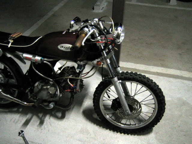 HONDA CB50JX | 続いてポン付けに近そうな車種。ローターが左側、キャリパーがフォークの前に付くのでスタイルとしてはちょっとアレだが、ベンリィのノーマルフォーク(Φ27)と同寸なのでフォークごと足回りの移植が可能らしい。(アクスルシャフトは同寸なのかな…?) ローターがただの円盤なのがちょっとアレ。純正は機械式なのでNSR50かNS-1などのキャリパを使って油圧化は必須。でもそうするとキャリパサポートが必要になってくる。 |  |