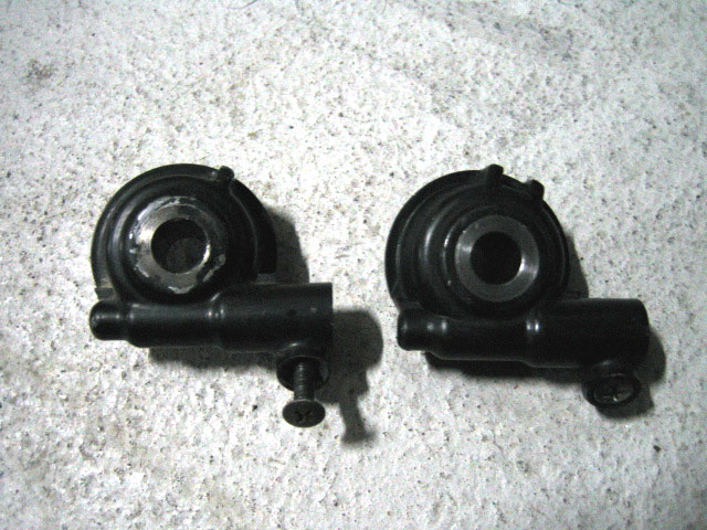 おうおう、やべー、マジでディスク化しちゃってるよコレ!!と、遠目に眺めつつワキワキ(謎)していたのだが、やっぱりさ、なんつーかさ、キャリパが前向きってどうよ?って誰かが囁いてる声が聞こえるわけ。(幻聴) 古い感じに仕上げてるわけでもないし、そこにある意味があんのか?もう一工夫出来ないんか?と、誰かが囁くわけですよ。そこで、顎に手を当てて考えた。んー…。アレがコレでコウなってるから…ってことは…。ピーン!! そうだ、NS-1のメーターギアを使おう!!(人差し指を立てながら) NS-1はご存知の通りローターが右側でメーターギアは左側。つまり、現状からそっくりそのままひっくり返る形になる。それはつまり、キャリパーが右後ろに来るという、限りなく理想に近い形になるということだ。果たしてソレは可能なのか…。 ここで新たに浮上する問題は、CRM80のハブにNS-1のメーターギアが付けられるか?である。まずはモノを入手…の前に、某オークションにて、NS-1のメーターギアをよ〜く観察する。大きさはともかく、姿形はかなり近いものがあるんじゃないの…?と思えるほど、使えそうに見えた。むしろこれは同じもの!?って言ってもいいんじゃないか。 双子疑惑(左がCRM,右がNS-1) | おし。そうと分かればとりあえずお仲間ネットワークに発信する。「えぬわんめーたぎあ、たのむ」(片手打ち) すると即座に「ありますよ」の返事。ホントもう、様様ですよ。2,3日後には手元にありました。 観察してみると、そいつらは一卵性双生児なんじゃないかと思うくらい酷似しており、何が違うってストッパーの形が一本と二本なことくらいしか違いが分からない。お前ら波平と海平かって話ですよ。内側のギアが噛む部分もほぼ同じ。勝ったな…。勝利を確信しつつ、CRMのハブに当ててみると…カポ。二人は一つになりました。(ハッピー) タイヤを軽く回してみるとクリクリ回るメーターギア。静かにガッツポーズしたのは言うまでもない。(させといて)
