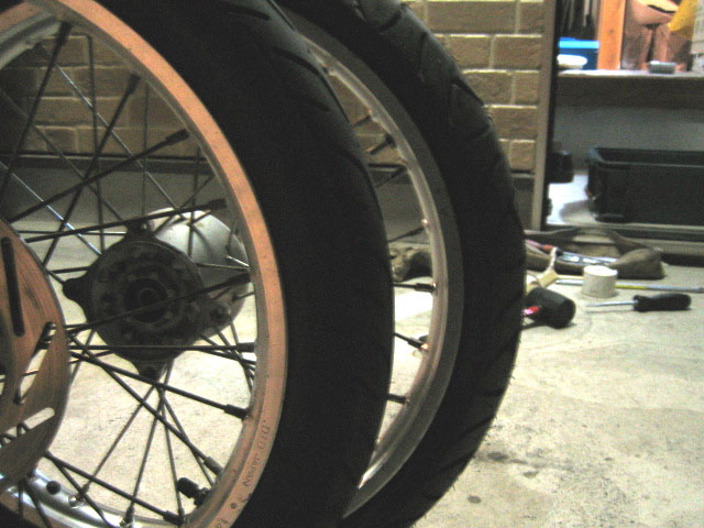 今まで数々の伝説を作ってきたが、流石にブロックタイヤのままで出来上がりってわけにはいかない。もちろんタイヤも新調してやるつもりだった。虫の知らせで聞いた、ミシュランのパイロットスポーティとやらが、中々よさげとの情報をゲット。2700円という値段と、70/90-17というサイズと、ナイスなタイヤパターンが、いい感じに扁平してカッコよく仕上がるんじゃ…!?と期待を膨らませる。リアも扁平した太いタイヤだけに、結構いい感じになりそうよ。 タイヤを入手していざ交換作業に入ると、またしても魔物の手が伸びる。リムの内側に、謎の物体が付着しているのだ。乾いた紙粘土のようなソレは、どうやらアルミの腐食による盛り上がりのようだ。こんなとこで盛り上がってんじゃねぇよ!!って言いたくなったが、ここは大人のヨユウで乗り切って、ヤスリでコリコリ均してやった。んー、なんだか何かが付着してるというより、腐食が進んでただれてるって言ったほうがいいかな。(汗) 残念ながら患部の写真は撮り忘れたのだが、このささくれ共がチューブを傷つけることがあってはいけないので、キレイに処理し、ガムテで覆ってリムバンドで固定した。一時は、こんな腐れリムを使って、またしても痛い目に遭うんじゃないか!?と不安になったが、リム自体の強度は素人目に見て十分だったことと、新しい扁平タイヤではなく、今まで使っていたBS EXEDRA551(2.75-17)を履かせてやることで、リムへの負担を減らせばいけるんじゃないかという目論見により、様子見がてら今までのタイヤを装着したのだった。ま、EXEDRAもそれなりにやる気のパターンだしね。タイヤ交換はコツがいるものの、難なく終了。リムが1.40幅になったこともあり、2.75サイズでも自然な仕上がりになった。やっぱり1.25リムに2.75はちょっと無理があったよなぁ。(今更)