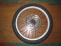 こんな感じです | パーツ探しといえば某オークションである。パーツ検索も出来るなんて、ネットオークションは何かと便利なものだ。さて。タイヤカテゴリにて早速検索してみると…発見!モノはCRM80のフロントタイヤ。ローター、タイヤ、アクスルシャフト付きで3000円くらいだった記憶。…記憶?記憶に薄いのは若年性アルツハイマーのせいではないことを断言しておこう。(謎) 実は、このパーツを発見したのは、もう数年も前のことなのだ。一時、ディスク化に向かって猛進(っていうか盲進)し、パーツだけ集めて断念した時期があった。その時の遺産が、このCRM80のホイルである。ローターに入っている穴が、細長いライン状で、ちょっとイカスんじゃないのコレ!!と思っていた。そして当然、マスター&キャリパーのブレーキセットも落札。純正品だけに、これらを合わせて5000円くらいで入手した。この当時、確実な流用情報なんてまるでなく、17インチでスポークでローターが付いてれば何でも来いな姿勢だったのだ。(無茶だったねぇ…) それらをデイトナフォークに合わせてみるも、キャリパーステーの形がまるで違うことにより装着は断念。(※オフ車はアクスルシャフトがフォークの途中にあるのでステーの形は結構違う) そのまま数年放置プレーに晒されていたというわけである。放置と言っても屋内保管であったので、今回はきっと熟成されたいい味を出してくれるに違いないと期待して採用することにしたのだった。